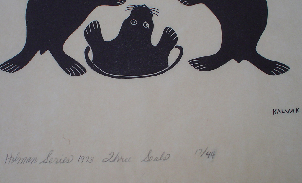 KerrisdaleGallery.com – Stock ID# KV717sh-sntd – Holman Series 1973 Three Seals by Helen Kalvak, information detail – stonecut, signed, titled, dated, numbered 17/44