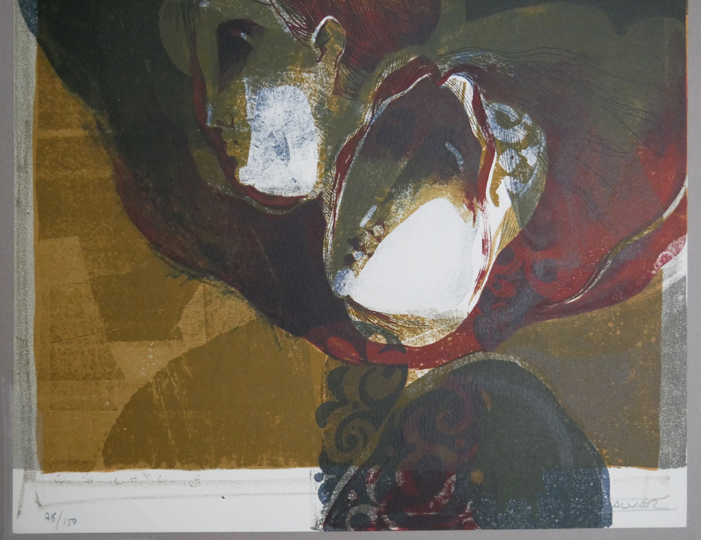 KerrisdaleGallery.com – Stock ID#MA096lv-sn – (untitled) “Woman Holding Dove” by Alvar Sunol Munoz-Ramos, detail to show edition number, signature and acid-free corner mounts – original lithograph, signed by artist and numbered 96/150