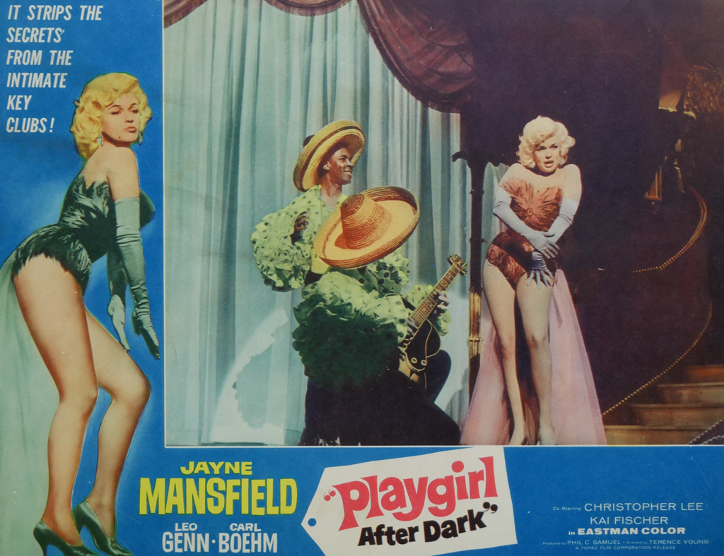 KerrisdaleGallery.com – Stock ID#MPLCx1PLY62ph – “Playgirl After Dark” (1962, Topaz, filmed in UK, poster for USA, NSS#62/279)- Original Vintage Movie Poster Lobby Card, single Number 3 – feature view – Neo-noir thriller starring Jayne Mansfield. Directed by Terence Young.