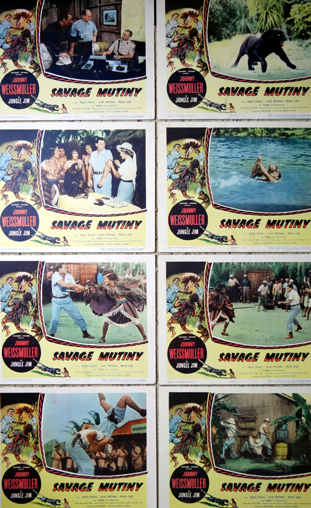 KerrisdaleGallery.com – Stock ID#MPLCx8SAV53ph – “Savage Mutiny” (1953, Columbia, USA, NSS#53/9)- Original Vintage Movie Poster Lobby Cards, Set of 8 – feature view – Action adventure starring Johnny Weissmuller, Angela Stevens. Directed by Spencer Gordon Bennet.