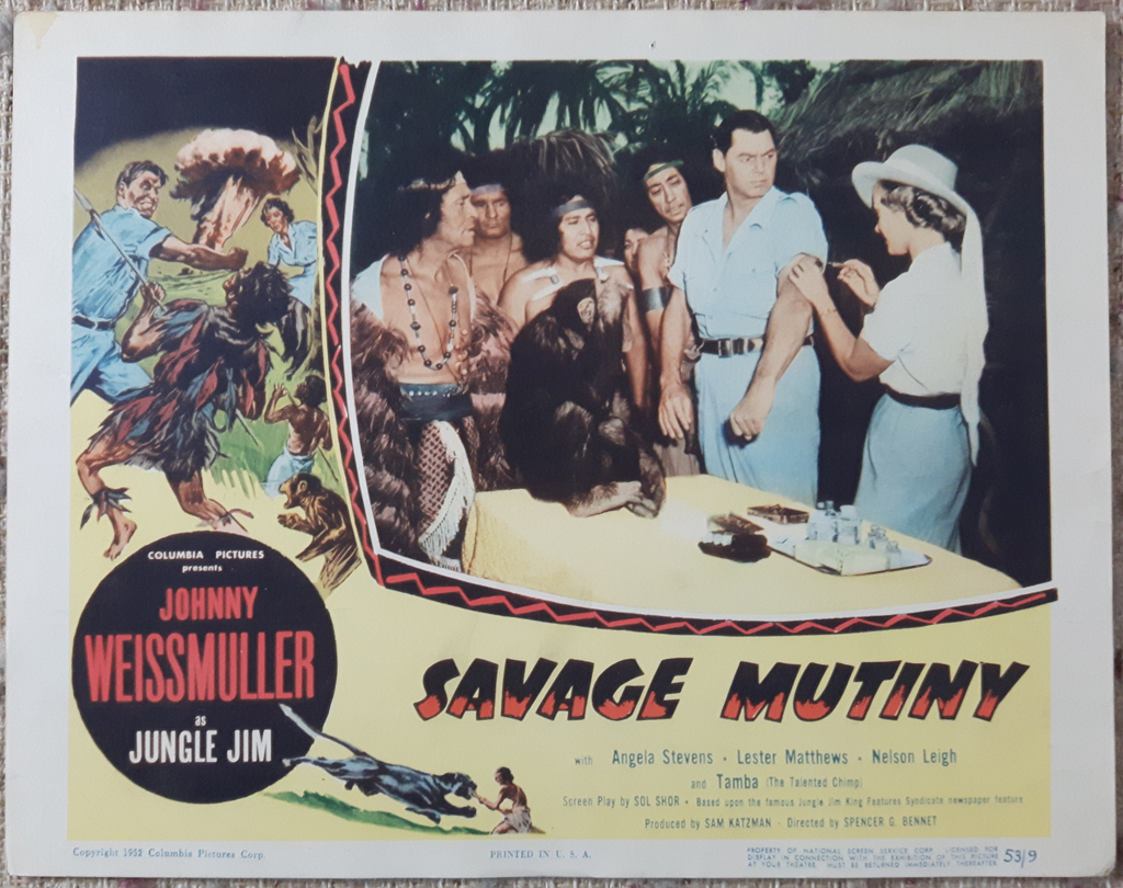 KerrisdaleGallery.com – Stock ID#MPLCx8SAV53ph – “Savage Mutiny” (1952, Columbia, 53/9) starring Johnny Weissmuller as Jungle Jim – 11×14 Lobby Cards, Set of 8, close up view of single with full margins to show condition – authentic vintage Movie Poster Lobby Cards