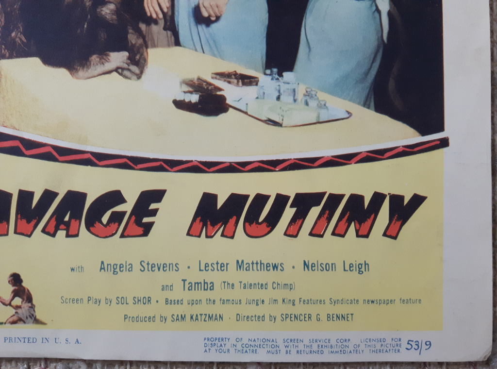 KerrisdaleGallery.com – Stock ID#MPLCx8SAV53ph – “Savage Mutiny” (1952, Columbia, 53/9) starring Johnny Weissmuller as Jungle Jim – 11×14 Lobby Cards, Set of 8, detail view to show text and condition – authentic vintage Movie Poster Lobby Cards