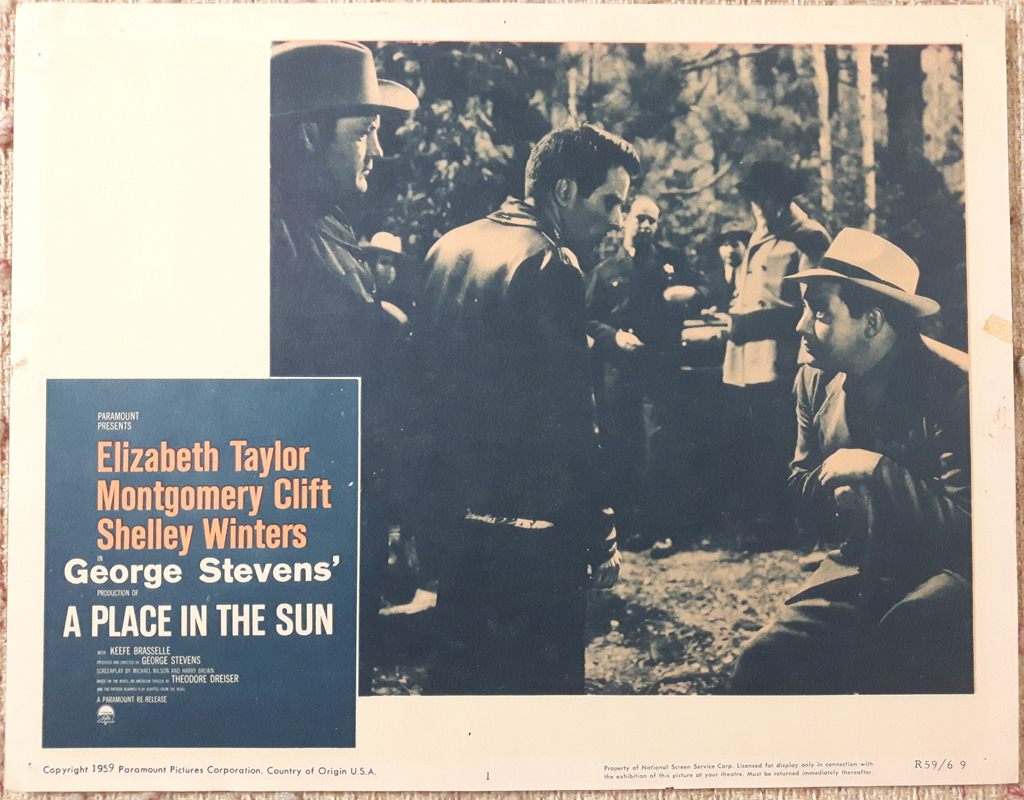 KerrisdaleGallery.com – Stock ID#MPLCx8SUN59ph – “A Place In The Sun” (1959, Paramount, R59/60) set of 8 Lobby Cards, starring Elizabeth Taylor, Montgomery Clift, Shelley Winters – close-up of lobby card #1with full margins to show condition – 11×14 lobby cards, each numbered 1 through 8 – authentic vintage movie poster lobby cards