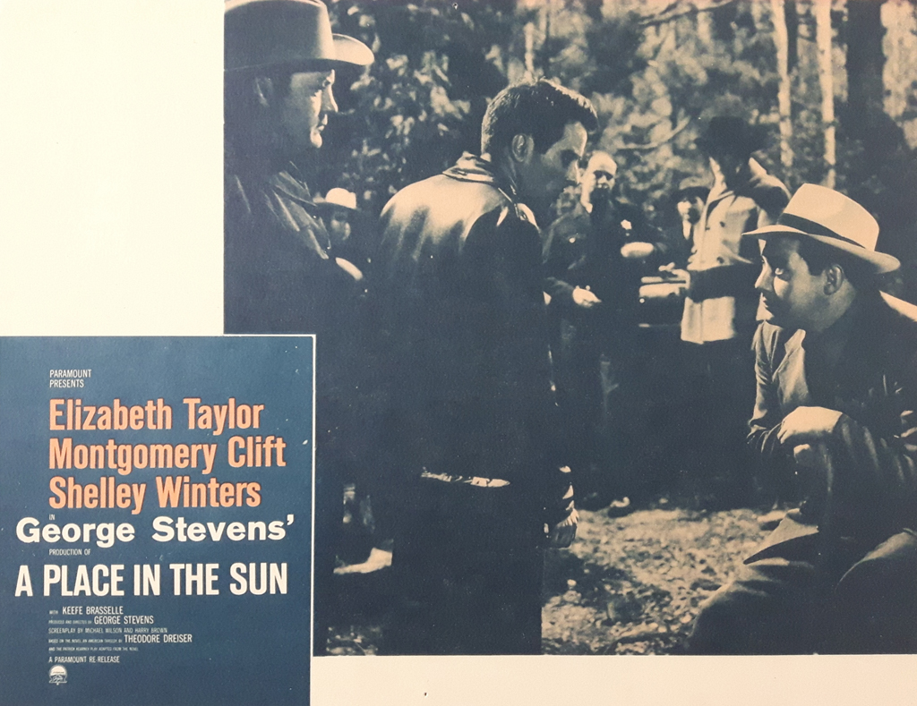 KerrisdaleGallery.com – Stock ID#MPLCx8SUN59ph – “A Place In The Sun” (1959, Paramount, R59/60) set of 8 Lobby Cards, starring Elizabeth Taylor, Montgomery Clift, Shelley Winters – close-up of lobby card #1 – 11×14 lobby cards, each numbered 1 through 8 – authentic vintage movie poster lobby cards
