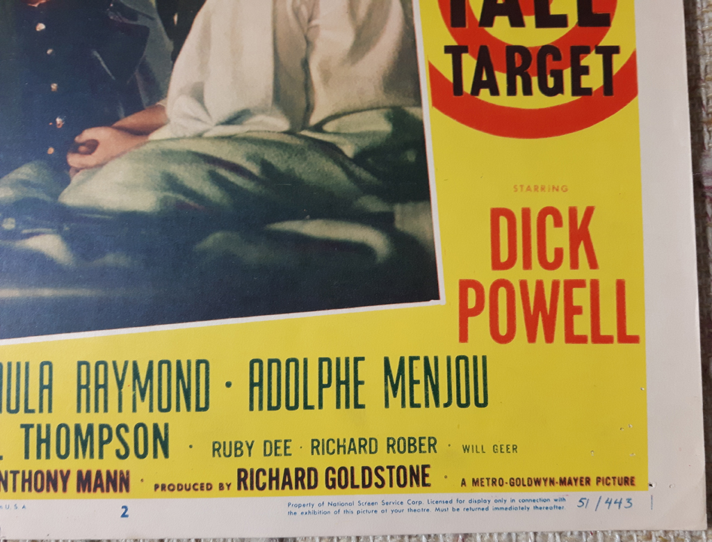 KerrisdaleGallery.com – Stock ID#MPLCx8TAL51ph – “The Tall Target” Set of 8 Lobby Cards (1951, MGM, 51/443) starring Dick Powell, Paula Raymond, Adolphe Menjou – detail to show text and condition – 11×14 lobby cards, each numbered 1 through 8 – authentic vintage movie poster lobby cards
