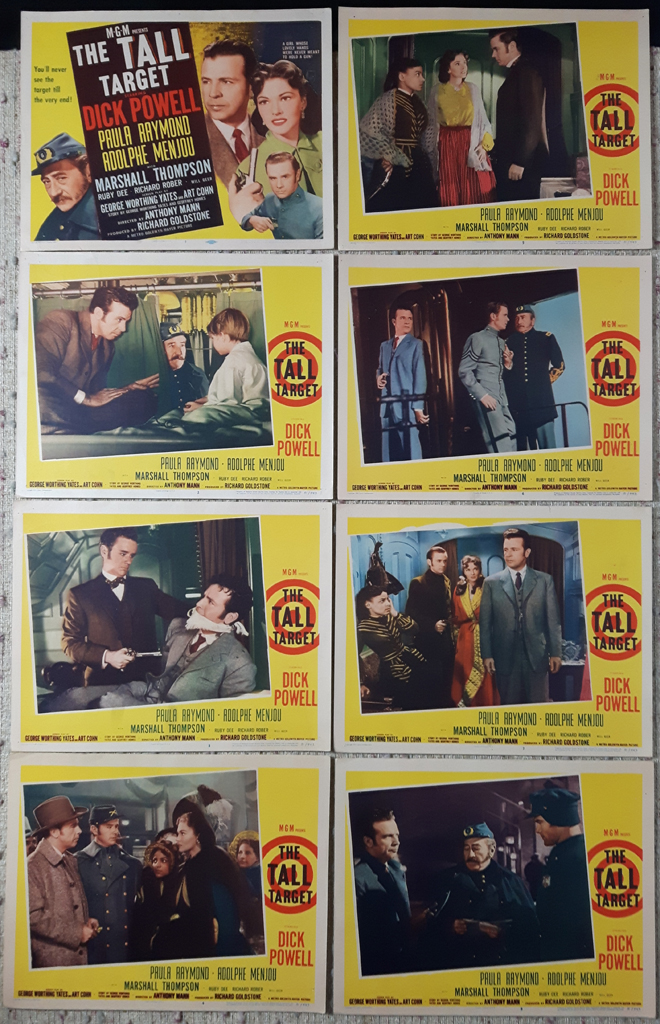 KerrisdaleGallery.com – Stock ID#MPLCx8TAL51ph – “The Tall Target” Set of 8 Lobby Cards (1951, MGM, 51/443) starring Dick Powell, Paula Raymond, Adolphe Menjou – view of full set with margins – 11×14 lobby cards, each numbered 1 through 8 – authentic vintage movie poster lobby cards
