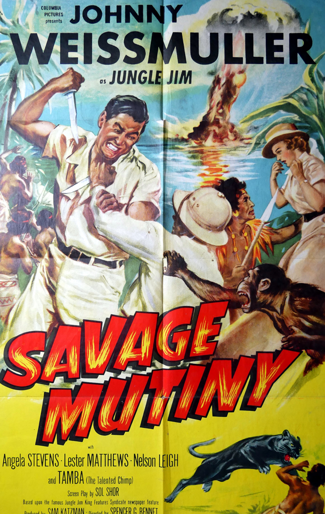 KerrisdaleGallery.com – Stock ID#MPOSx1AV53pv – “Savage Mutiny” (1953, Columbia, USA, NSS#53/9)- Original Vintage Movie Poster One Sheet/folded 1-SH, 27 x 41 inches – feature view – Action adventure starring Johnny Weissmuller, Angela Stevens. Directed by Spencer Gordon.