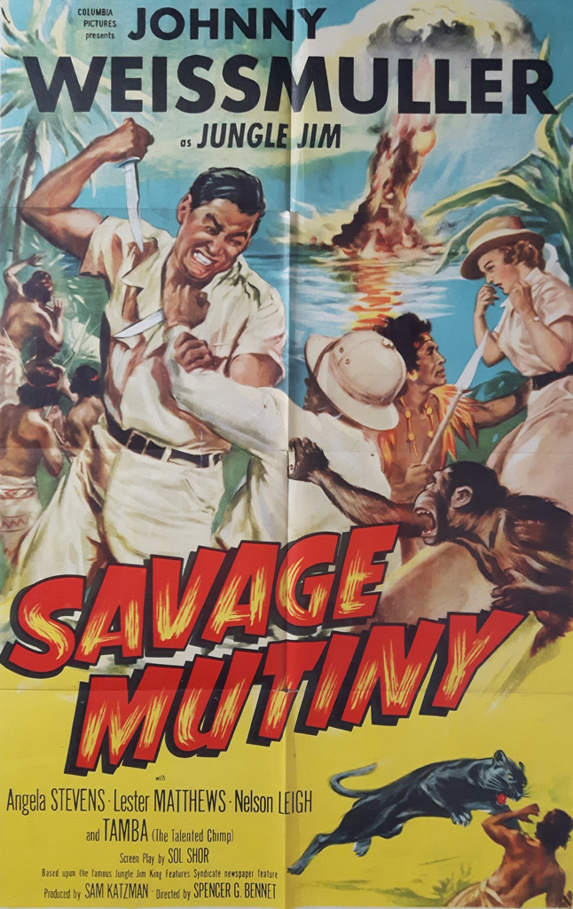 KerrisdaleGallery.com – Stock ID#MPOSx1SAV53pv – “Savage Mutiny ” One 1 Sheet, 41″x27″(1952, Columbia, 53/9) starring Johnny Weismuller as Jungle Jim – close-up view without margins – authentic vintage movie poster 41×27 one sheet/ 1 sheet