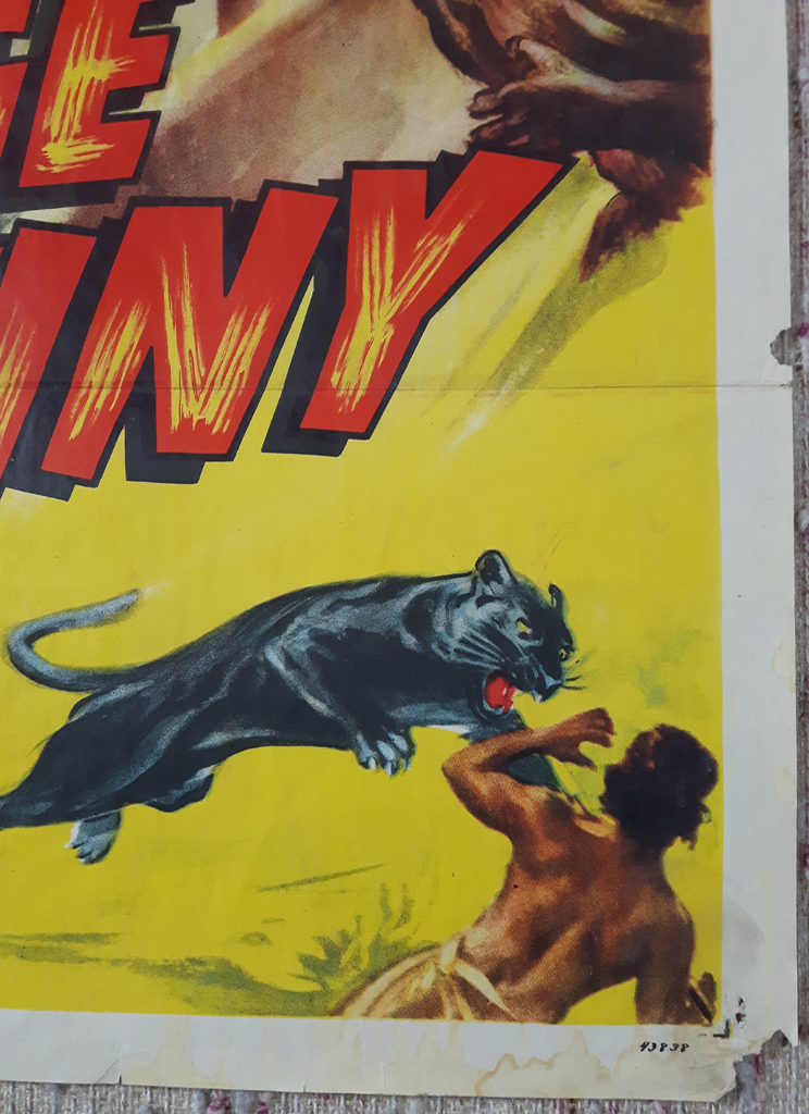 KerrisdaleGallery.com – Stock ID#MPOSx1SAV53pv – “Savage Mutiny ” One 1 Sheet, 41″x27″(1952, Columbia, 53/9) starring Johnny Weismuller as Jungle Jim – detail view to show text and condition; poster is numbered 43838 in lower right corner, as shown, and has the National Screen Service number 53/9 stamped on reverse side – authentic vintage movie poster 41×27 one sheet/ 1 sheet